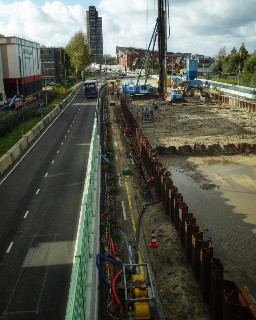 De damwanden worden verankerd.