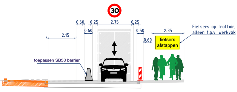 Tijdens de werkzaamheden is één rijstrook afgesloten. Het verkeer rijdt tijdelijk om en om, ook voor vrachtverkeer. Fietsers en voetgangers maken gebruik van het trottoir langs het werkgebied.