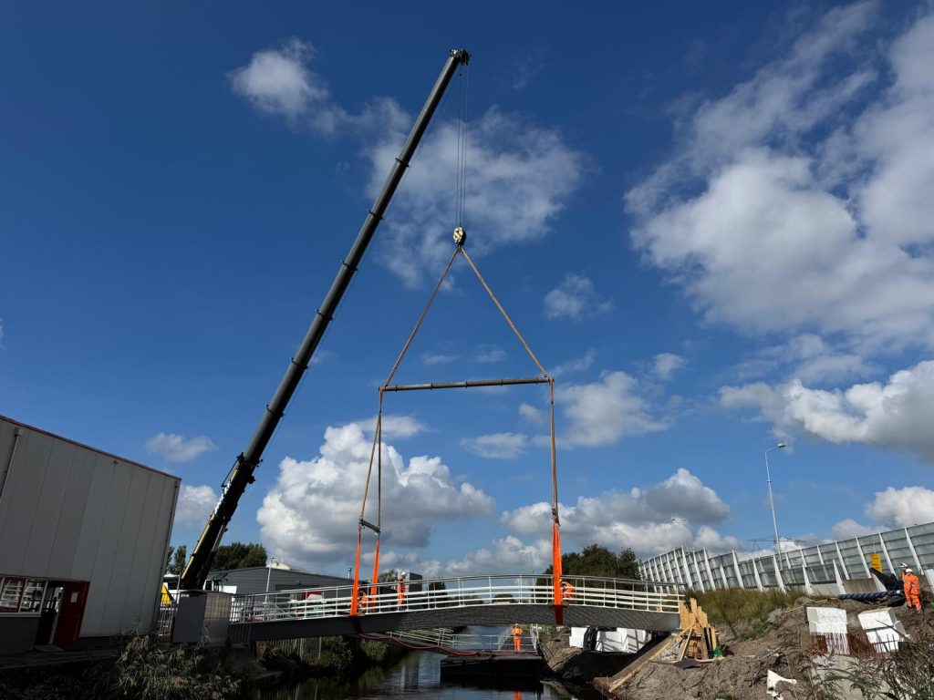 Het inhijsen van de brug is goed verlopen. Met mooi weer en goede onderlinge samenwerking, werd de nieuwe brug snel geplaatst.