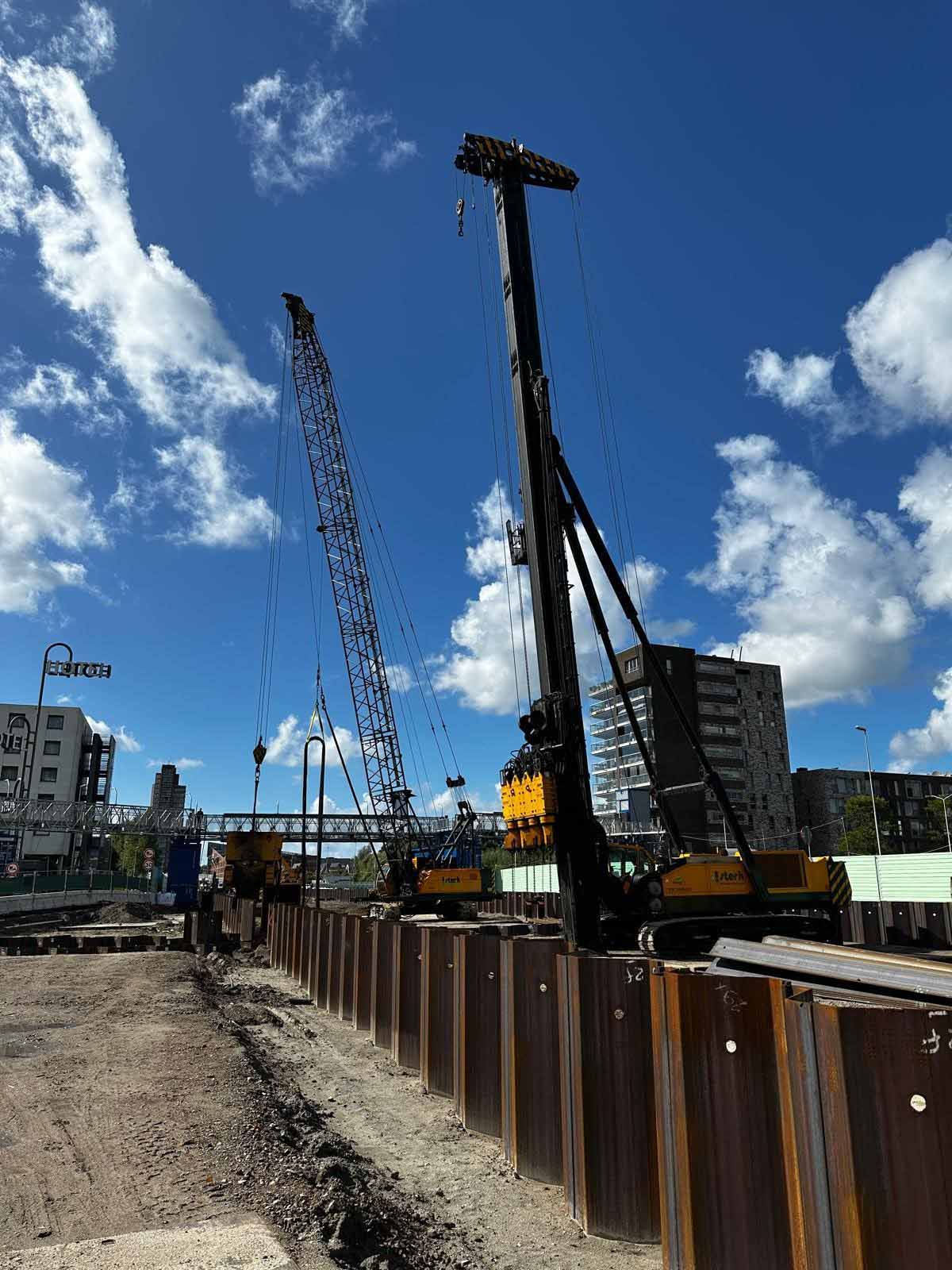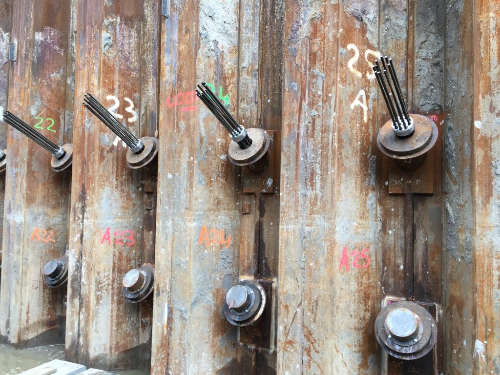 Afgelopen periode is aannemer Boskalis druk bezig geweest met het aanbrengen van alle damwanden. De damwanden zijn geplaatst om later de fundering aan te brengen en de tunnelbak te ontgraven tot een diepte van 6 meter. Dit is half september afgerond. Aansluitend is er gestart met het aanbrengen van de strengankers. Dit zijn ankers die door de damwand heen steken en schuinweg diep de grond in gaan om de bovenzijde van de damwand op zijn plek te houden als de tunnelbak wordt uitgegraven.