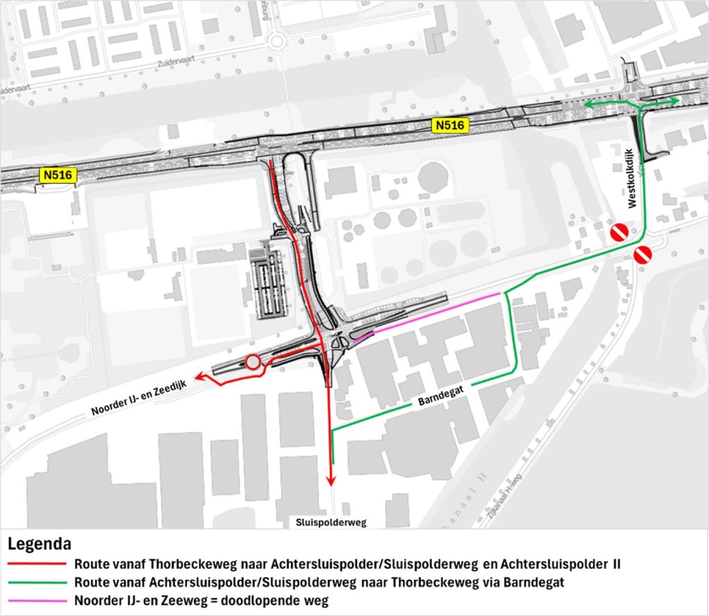 Tijdens de laatste fase van de werkzaamheden voor de nieuwe inrichting van het kruispunt Noorder IJ- en Zeedijk / SLuispolderweg is er geen verkeer mogelijk vanaf de N516 via de Westkolkdijk naar de Noorder IJ- en Zeedijk.