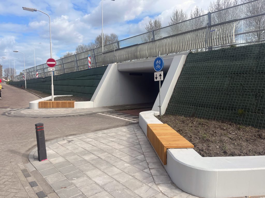 De tunnel is al een paar maanden open . In het plantseizoen (oktober / november) zullen wij de beplanting gaan aanbrengen. Ook plaatsen we later de laatste leuningen langs het fietspad.