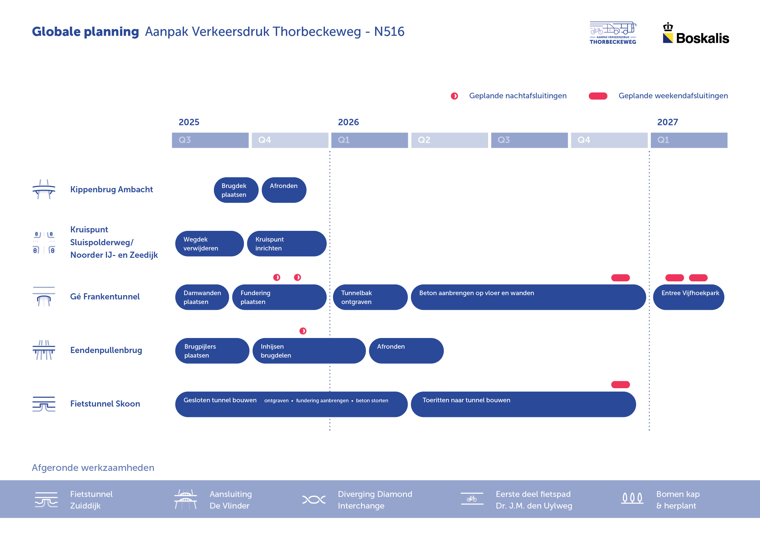 Het project Aanpak Verkeersdruk Thorbeckeweg – N516 bestaat uit 4 fasen: verkenning, planstudie, planuitwerking en realisatiefase. We bevinden ons in de realisatiefase. In de zomer van 2024 is Boskalis, de aannemer, met de hoofdwerkzaamheden gestart.